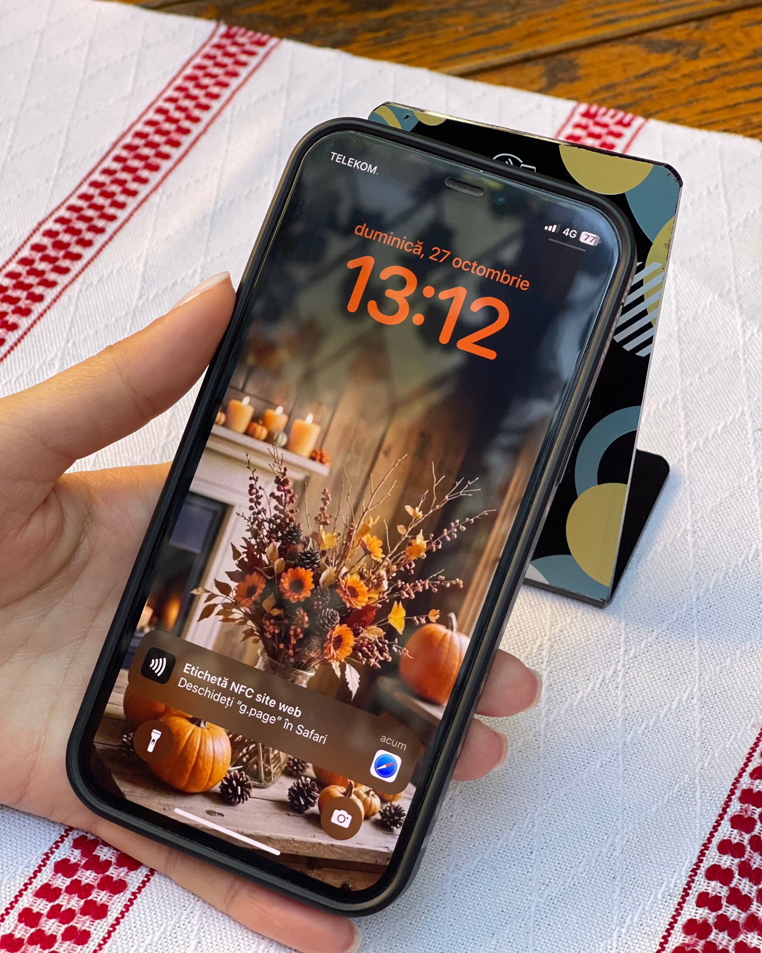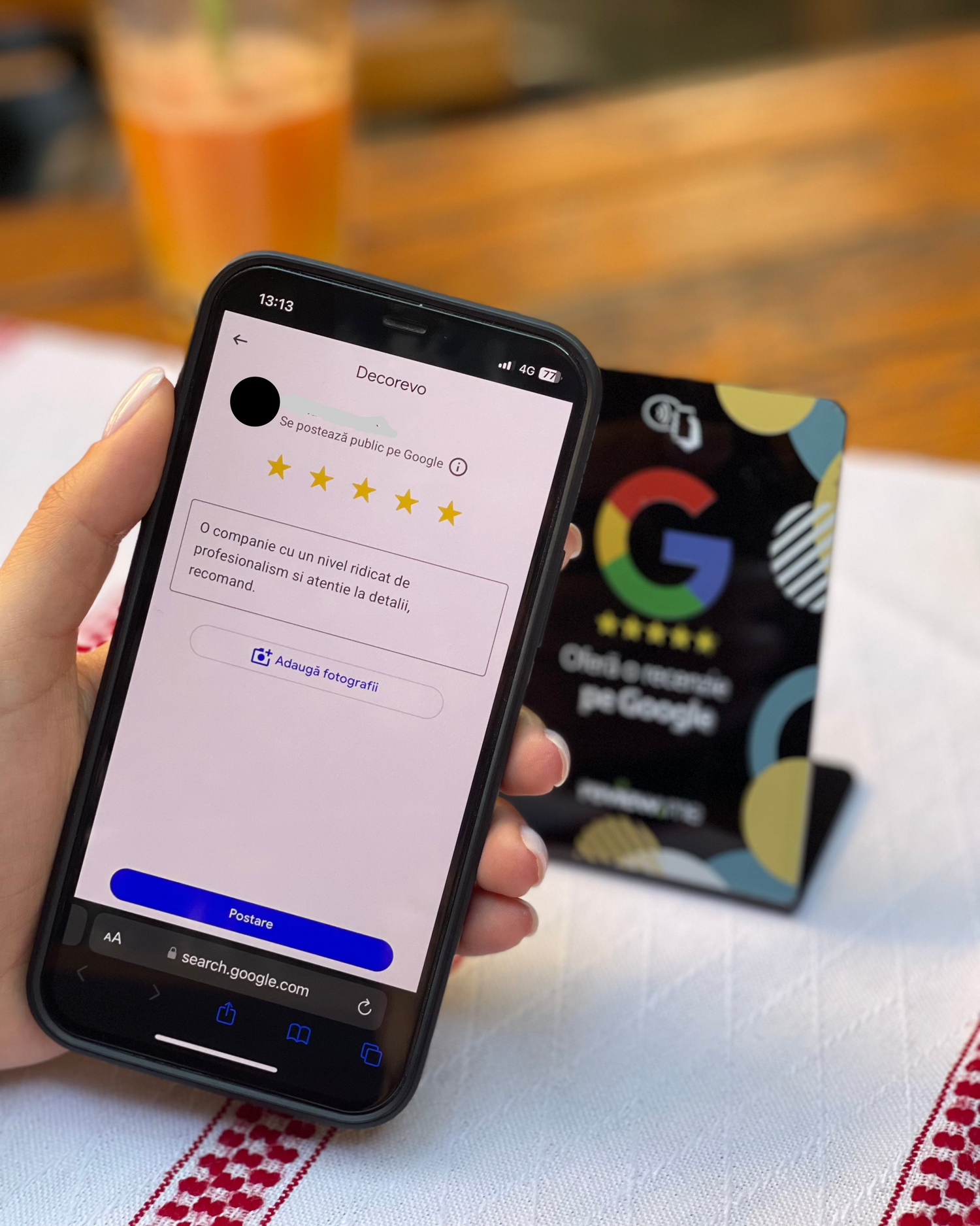 Atinge telefonul de cardul NFC de recenzii – acesta funcționează automat pe majoritatea smartphone-urilor moderne. - Accesează pagina de recenzie